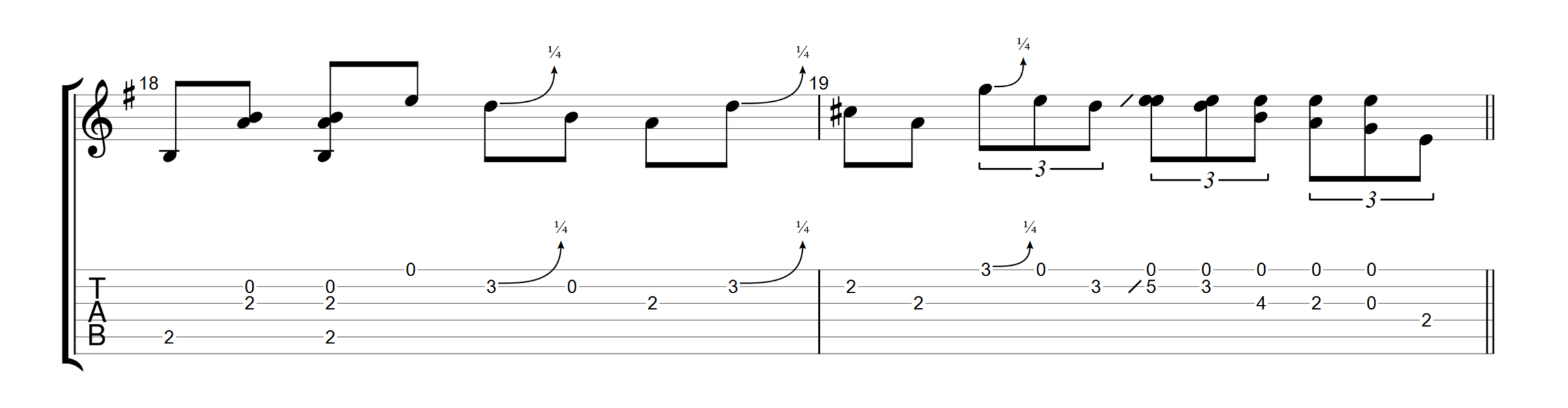 Full bends can be difficult on the acoustic guitar. Fortunately, in Delta Blues, we often use microtonal bends – notated as 1/4 bends – as a subtle way to add emotion to a note. Playing them is the same as playing half-step and whole-step bends but push the string a small amount. You are looking for a slight bend that pushes the note a little sharp.