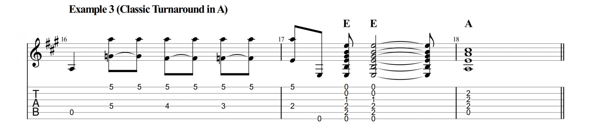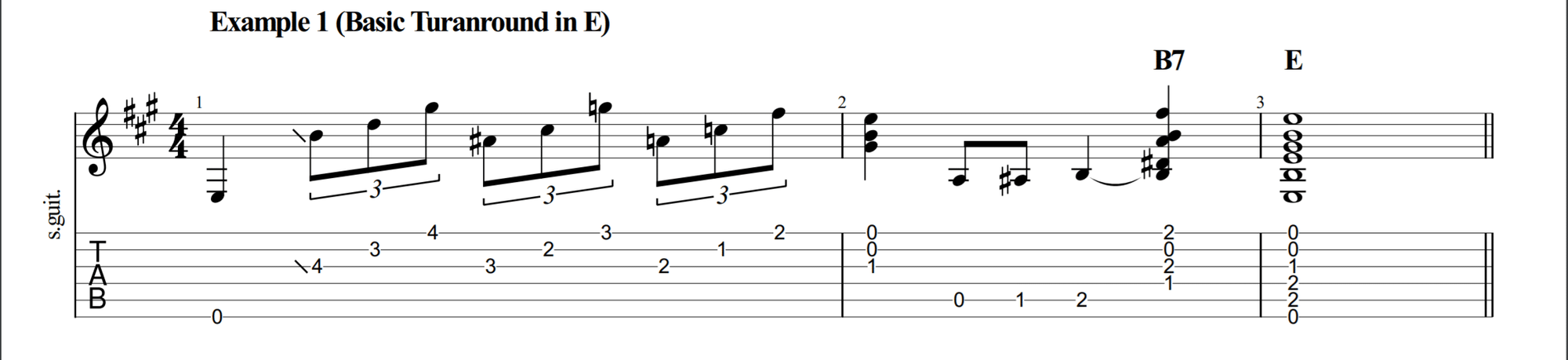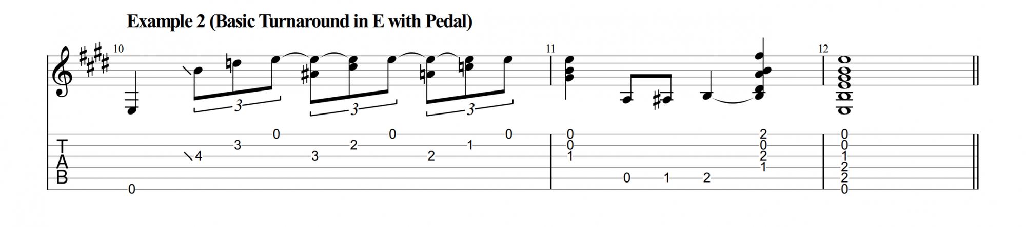 Remember that the turnaround takes place in Bar 11 and 12 which is normally where we play the I chord (E in this key). We’ll embellish the E chord until the end of Bar 12 where we visit the V chord (B7). This creates tension that pulls the progression back to the start.