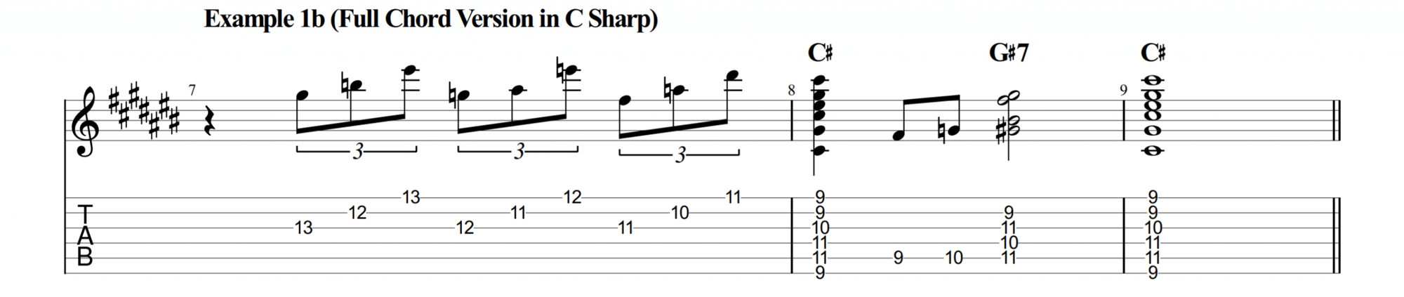 Follow up by strumming through the V chord, G#7. In Example 3a, I used a simplified voicing of the V chord by only using a few notes from the chord. If you want a bigger sound, try strumming through barre chords like in Example 3b.